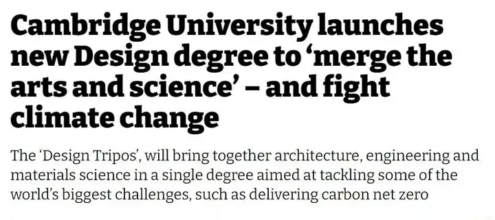 11月初,剑桥大学通过官网公布全新的四年制本硕联合课程——Design Tripos。该学位课程,首次将该校国际领先的三个专业:建筑、工程和材料科学整合到一个学位中,希望为世界培养能解决社会、环境和人类可持续发展等最紧迫挑战的顶尖人才。
